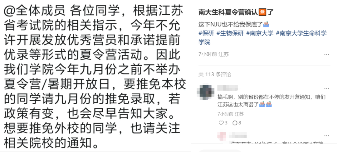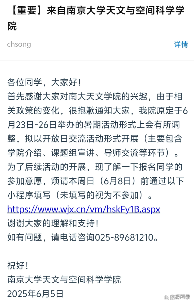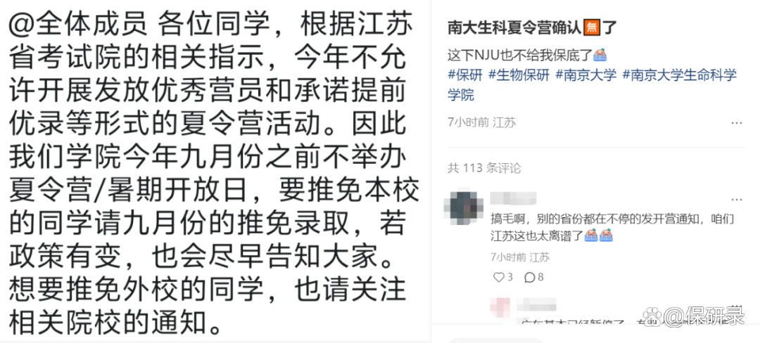 虽然25夏令营风云万变,但教育部尚未正式发布2025年夏令营活动规范文件,各高校及相关机构对夏令营宣传口径仍保持审慎态度。但今日最新消息,南京大学生命科学学院已明确通知:依据江苏省教育考试院指导意见,2025年度各类学术夏令营将严格规范活动形式,禁止出现"提前锁定录取资格""预录取承诺"等涉及招生选拔的表述及环节。