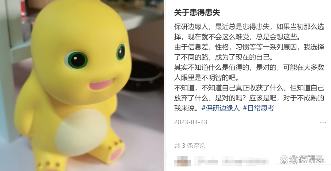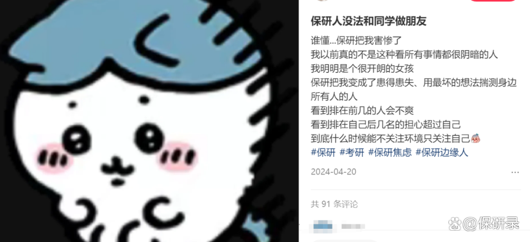 “患得患失”是保研路上最消耗心力的情绪陷阱。在这个充满不确定性的过程中,许多保研er陷入了过度焦虑的恶性循环:担心保研政策突然调整,害怕九推时排名下滑,忧虑入营名单没有自己,甚至到了食不知味、夜不能寐的地步。这种持续的精神内耗不仅无助于保研准备,反而会严重影响复习效率和面试发挥,最终可能导致事与愿违的结果。