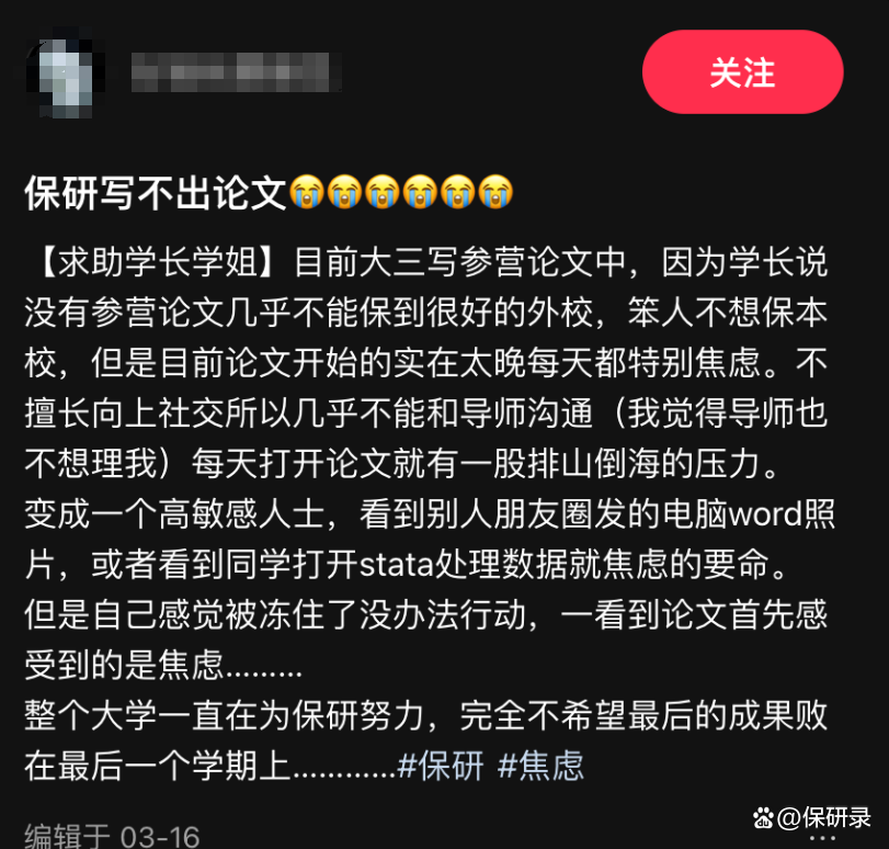 有的保研er深知参营论文对保外校的重要性,却因害怕导师的否定而迟迟不敢寻求指导。每天面对着空白的文档,既焦虑于同学都在快速推进论文,又因自我怀疑而迟迟无法动笔,形成越焦虑越拖延、越拖延越焦虑的恶性循环。更矛盾的是,TA一边渴望通过优质论文实现保外校的梦想,一边又回避与导师沟通这个最关键的支持渠道,宁愿在孤立无援的状态下自我消耗,也不愿跨出向上社交那一步。