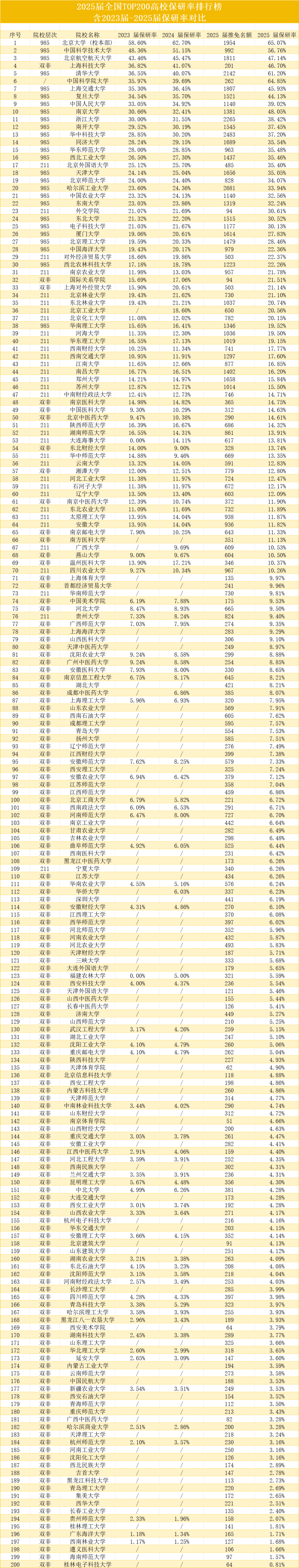 下面是2025年全国TOP200高校最新保研率排行榜,包括2023届—2025届保研率对比: