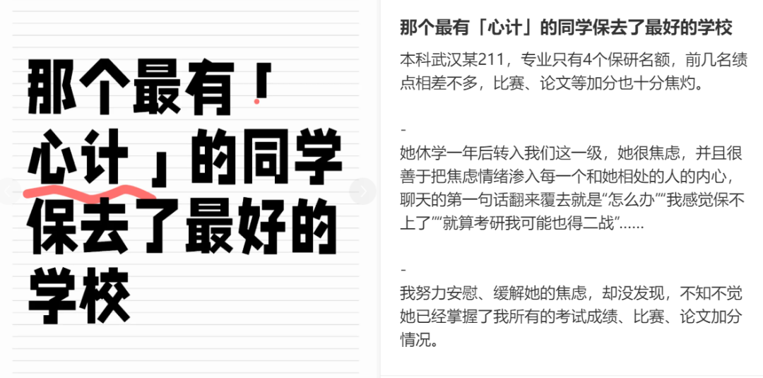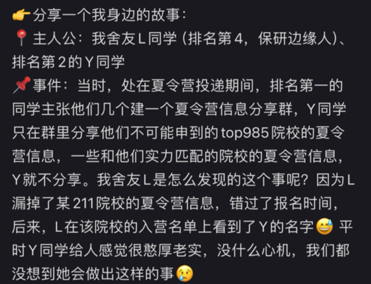 有些套话者会营造“我们不是竞争关系”的假象,约定信息共享、一起努力,声称可以放心交流。一开始双方似乎确实保持良好的合作关系,但随着保研时间临近,却有人瞒着其他人参加竞赛或夏令营。