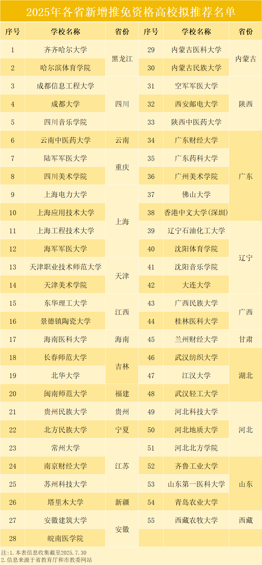 申报启动以来,各省教育厅陆续公示新增推免资格高校拟推荐名单,截至2025年7月30日,已更新至25个省份的55所高校被拟推荐为新增推免资格高校,具体名单如下: