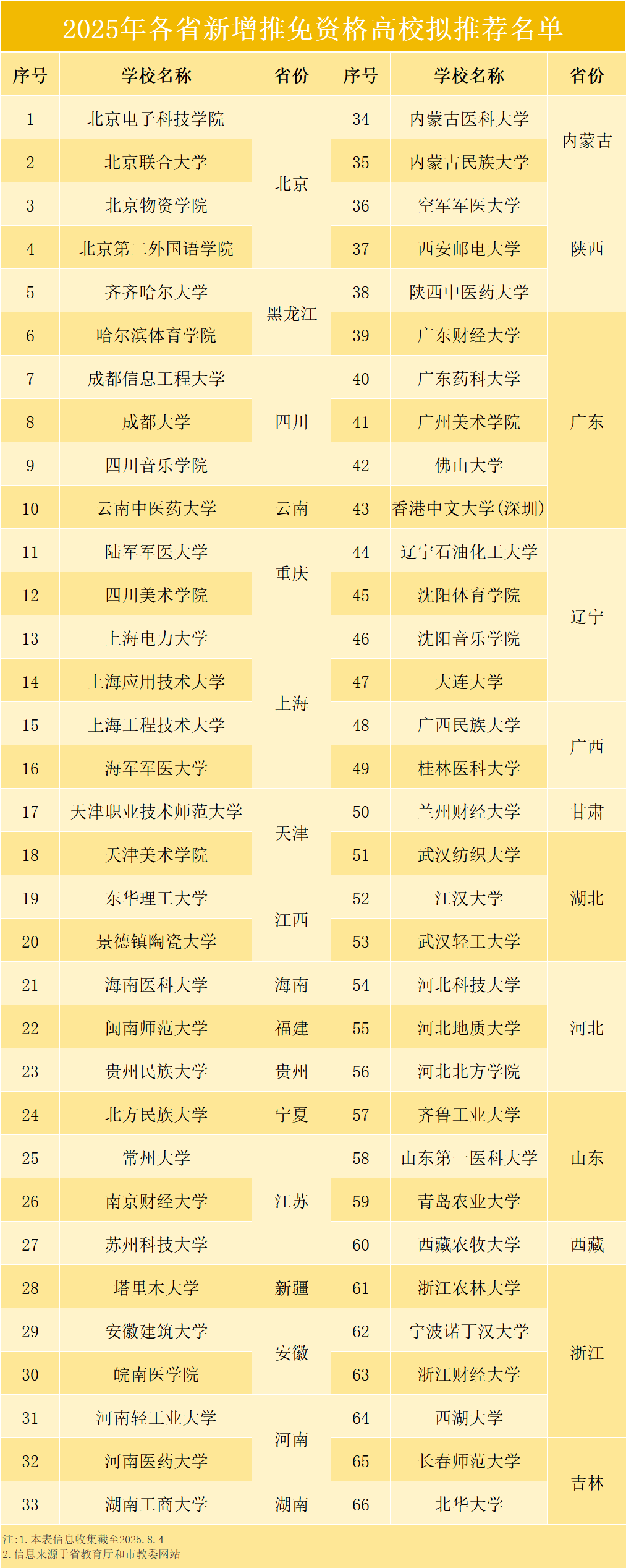 截至2025年8月4日,已经有29个省份,66所高校被拟推荐为新增推免资格院校,具体名单如下: