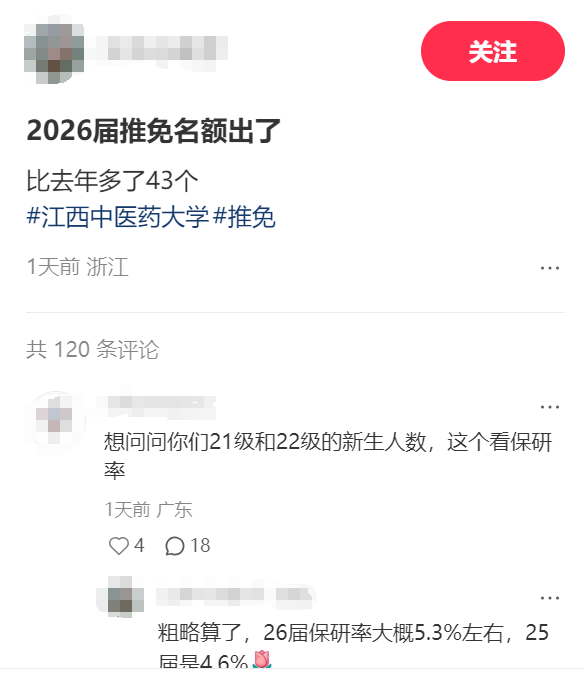 最新消息!有同学发帖称“江西中医药大学2026届保研名额已下发”,帖子截图中表示江西中医药大学今年的保研指标为202人,相较2024年公布的159人,增长了43人。
