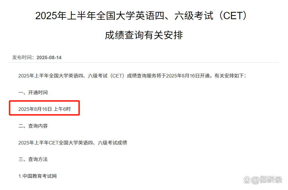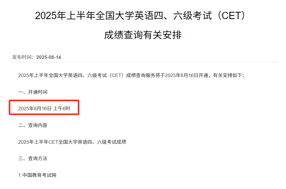 2025年上半年全国大学英语四、六级考试(CET)成绩查询服务将于2025年8月16日开通,有关安排如下: