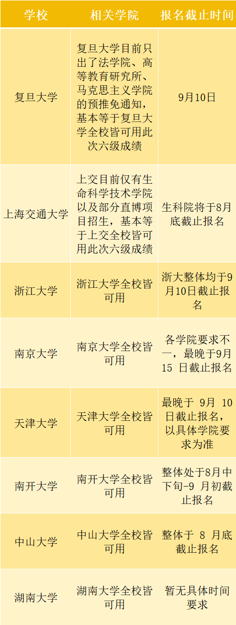 小录梳理了一些今年四六级成绩仍有作用的985高校预推免招生通知。总体而言,除清华、北大、人大之外,其他大部分学校都允许考生等此次四六级成绩公布后再进行报名,或者对已提交的信息进行更新。