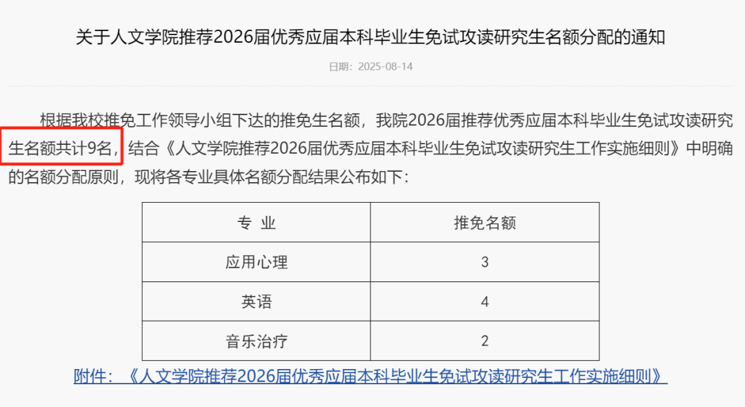 江西中医药大学人文学院于8月14日在官网发布2026 届推免名额分配通知,共计9个名额,其中,应用心理3人、英语4人、音乐治疗2人。
