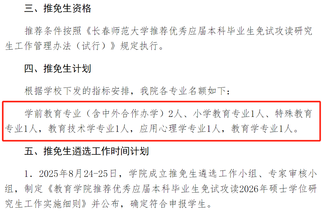 长春师范大学教育学院于8月25日公布2026 届推免名额分配通知,学前教育专业(含中外合作办学)2人、小学教育专业1人、特殊教育专业1人,教育技术学专业1人,应用心理学专业1人,教育学专业1人。