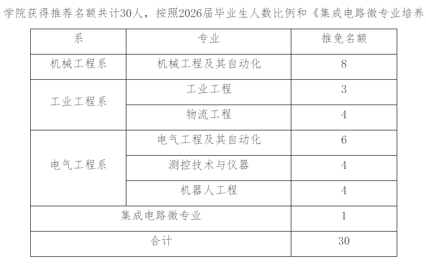 学院共获得 30 个推免名额,按专业分配如下:机械工程及其自动化 8 人、工业工程 3 人、物流工程 4 人、电气工程及其自动化 6 人、测控技术与仪器 4 人、机器人工程 4 人、集成电路微专业 1 人。