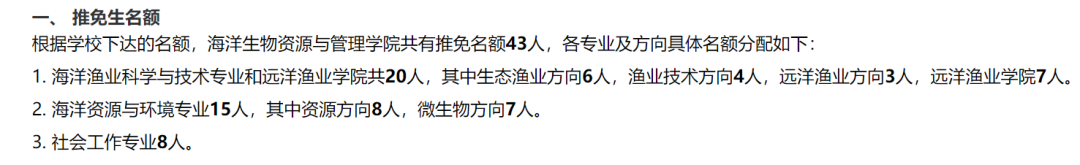 共有推免名额 43 人,其中,海洋渔业科学与技术专业和远洋渔业学院:共 20 人。海洋资源与环境专业共15 人。