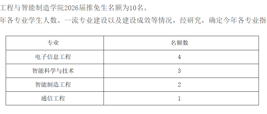 湖南工商大学智能工程与智能制造学院于 8 月下旬更新推免名额信息,2026 届推免名额为 10 人,其中,电子信息工程:4 人、智能科学与技术:3 人、智能制造工程:2 人、通信工程:1 人。