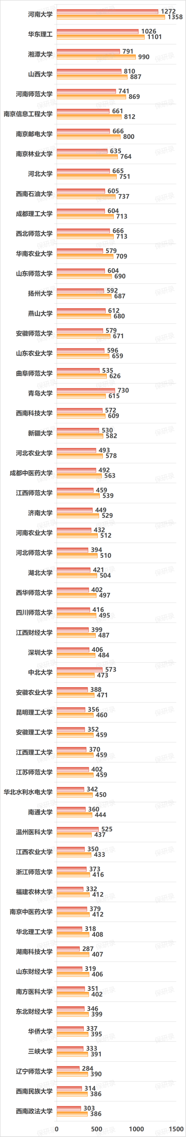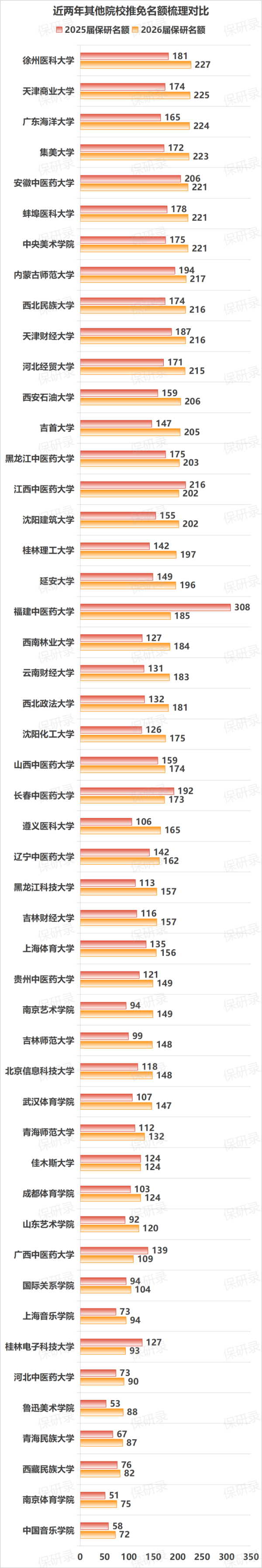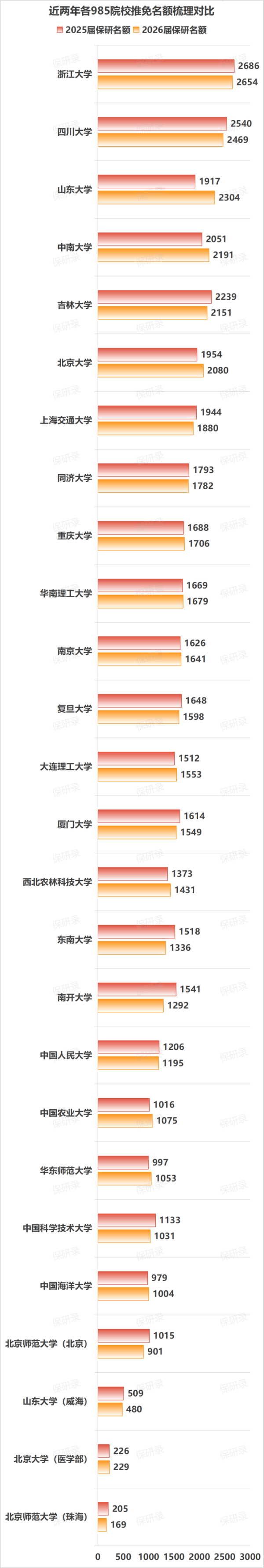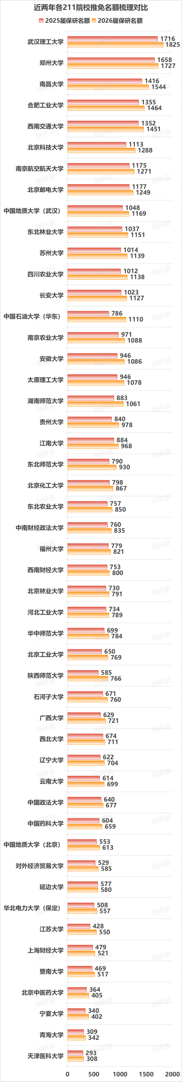 结合最新数据,2026届各大985高校整体仍呈扩招为主、微调为辅的格局。在统计的29所985高校中,有18所名额同比上涨,约占62%。 在一众985院校中,浙江大学依旧一骑绝尘,以2686个保研名额居首,较去年增长32人(+1.2%)。 但更值得关注的是部分中坚985高校名额的强势扩增:山东大学由1917增至2304,同比增长20.1%,是本轮榜单中增幅最高的一所高校;中南大学名额上涨6.8%(+140人),总量逼近2200,继续巩固其中西部名额大户的地位;北京大学虽为传统顶尖院校,但今年亦增长了125人(+6.4%),显示其在推免结构上可能加大了对交叉学科、本硕一体化项目的支持力度;如吉林大学、重庆大学等院校名额也增长超过70个,上涨率均在3%~4%之间。 小录分析: 这几所院校名额快速增多的背后,可能的动因有: 1、本科毕业生规模扩大,本校学生保研压力随之加剧,学校适度放宽推荐比例; 2、“留优质生在本校”倾向增强,尤其是“本科-硕士-博士”贯通式培养越来越受重视; 3、中西部高校在人才竞争中逐步加强推荐话语权,增加推免机会是提升生源黏性的关键一招。 不过,并非所有985都走在扩张路上。如复旦大学2026届推免名额为1598人,较去年下调50人(-3.0%);厦门大学同比减少65人(-4.0%);同济大学与上海交大也出现轻微缩水,分别减少11人(-0.6%)和64人(-3.3%);南京大学、东南大学、中国人民大学等则基本维稳,仅作个位数调整。 小录分析: 这些高校只作微调背后,一般与以下因素相关: 1、学校对推荐名额精打细算,防止推免生源质量稀释; 2、推进更严格的选拔制与综合评估机制,宁缺毋滥; 3、部分专业或年级学生人数下降,使得推荐总额有所收缩。 部分传统小而精985也呈现出差异化路径:如中国农业大学由1016人增至1075人(+5.8%),西北农林科技大学也上涨4.2%,反映出国家在涉农领域研究人才培养的倾斜。 相比之下,北京师范大学的名额持续减少,同比下滑达17.5%,是名额缩水幅度最大的985之一。 相比985高校整体稳中有涨的节奏,211高校在推荐名额上的调整,则显得更为激进且多元。 保研迷茫🤔,不知如何努力? 点击一键测试👇👇 生成属于你的个性化【保研规划报告】! 在所统计的54所211高校中,有超过80%学校出现了名额增长,个别院校同比涨幅甚至超过40%。 中国石油大学(华东)从786跃升至1110人,增长324人,涨幅达41.2%,是本轮211高校中绝对的扩招之最。这背后,很可能是学校在能源、工程方向重点学科上谋求研究型人才自供给; 合肥工业大学推免名额上涨182人(+14.2%),在工程类院校中表现亮眼;西南政法大学、湖南师范大学、苏州大学、东北师范大学等传统211强校也都出现10%-20%不等的名额增长。 小录分析: 这些院校扩招的背后逻辑不尽相同,但有几个共通点: 1、本校硕士点扩展、专业调整,需要更多推免生源以补充研究梯队; 2、本硕连读、贯通式培养机制逐步推开,保研作为内部通道需求提升; 3、部分区域院校为稳定生源、增强本科吸引力,以推荐名额作为“优惠政策”扶持。 不少综合类211传统强校,如南京航空航天大学由1157涨至1271(+9.8%);北京邮电大学由1177涨至1249(+6.1%);这些行业特色高校,本校硕士吸引力强、对口就业竞争大,扩推荐更像是为了托住顶尖生源。 也有部分院校的推荐名额仍较保守:北京中医药大学、天津医科大学、宁夏大学、青海大学等,仍处于600名额以下或个位数增长区间;部分西部/双非升211院校,如石河子大学(671→760)、延边大学(577→580)、新疆大学(469→517),则仍处于政策拉动缓慢的爬坡阶段。这类院校研究生培养规模受限,且教学资源有限,无法快速扩张;同时,它们对保研管理更为严谨、保守,以控制升学质量。 新增推免院校 首届保研名额总览 同时,非常值得关注的是,有67所高校,在2026年获得了首批推免名额! 在所统计的39所高校中,喀什大学首发即189个名额,高居本榜首,名额数量直接对齐部分中部211;郑州轻工业大学、广西民族大学、塔里木大学、成都大学等,也都拿到了100+的名额,几乎相当于一线211高校早期保研配置;河北科技大学(115人)、湖南工商大学(114人)、北华大学(114人)同样放量较快。 这些新晋推免高校,大多拥有区域优势或专业特色,发挥“服务地方、稳住本科生源”的战略作用。 其他院校 推免名额总览 最后,除985、211和新增推免院校的风向外,一批地方本科高校,正在以惊人的速度,在保研通道中抢占一席之地。 它们不属于传统意义上的重点扶持梯队,但靠着稳定的办学质量、扎实的生源基础和不断提升的研究能力,默默出圈。 这些地方院校在2026届的推荐名额上,几乎全线增长:近百所高校年推免名额超过300人,甚至有数十所达到了500人以上;其中郑州大学(1368人,+96)、福州大学(990人,+199)、湖南师范大学(800人,+165)、燕山大学(869人,+228)等强校,名额甚至比不少211还高出一大截。 小录分析: 这些高校的扩张并非空心膨胀,而是基于以下三个趋势: 1、区域优秀高校强势崛起。这类院校在区域内具备较强影响力,很多省属一本招生线接近985,校内学科结构健全,具备向上争取更多推免权的能力与资源; 2、部分地方重点高校原本就具有优质研究基础,只是此前未被纳入传统强校范畴,如南昌大学、贵州大学、西南石油大学等,正借着保研扩容风口实现从教学型到研究型的升级; 3、本地留才战略推动高校主动提升推免名额,借以减少优秀学生外流现象。 名额激增背后的结构性内卷 