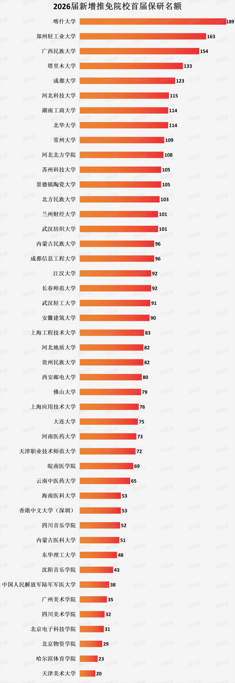 就在近期,全国300余所高校陆续完成推免名额公示。数据显示:超六成985高校仍在扩招,而部分211院校涨幅惊人,个别甚至激增超40%;更值得注意的是,全国共67所高校首次跻身保研赛道,其中,喀什大学首发名额即高达189人,几乎追平中部211。
